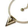 Colar Triângulo. Possui uma tira redonda em couro, ponteira em metal nobre em formato de triângulo com aplicação de couro da mesma paleta de cor do colar. Fechamento em lagostin, com extensor.